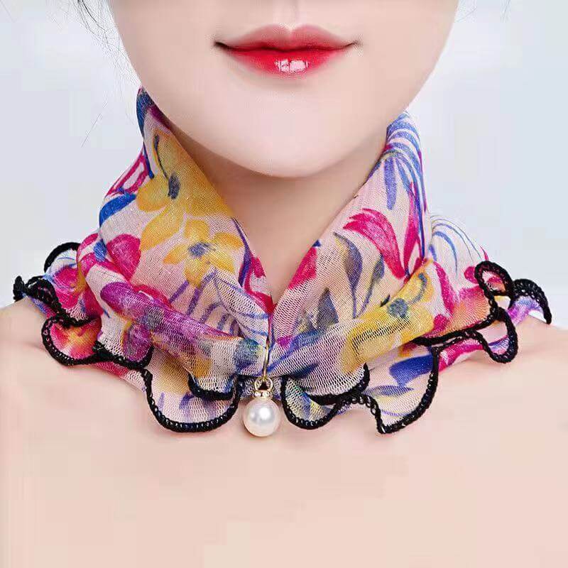 珍珠絲巾圍脖女新款護頸套脖圍巾薄款時尚防曬護脖百變絲巾小圍巾