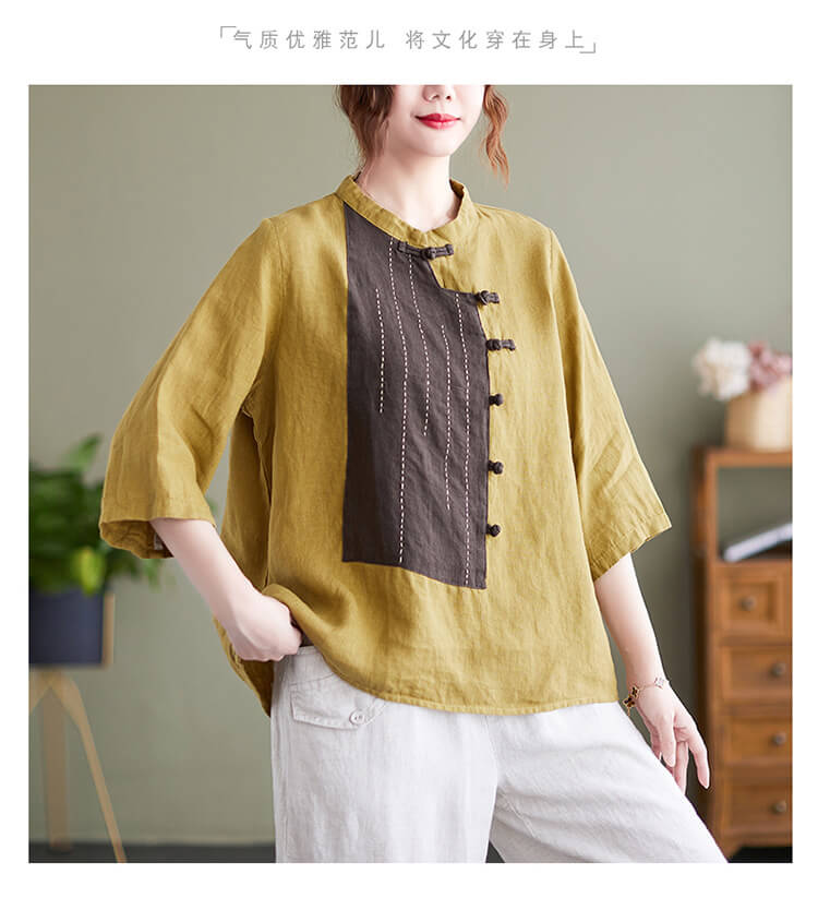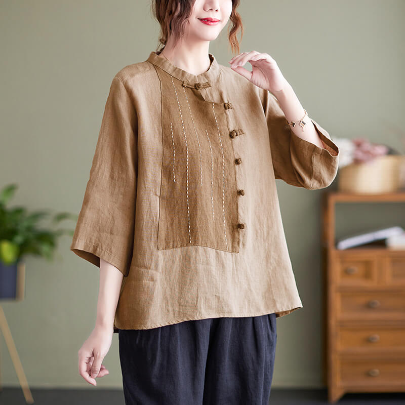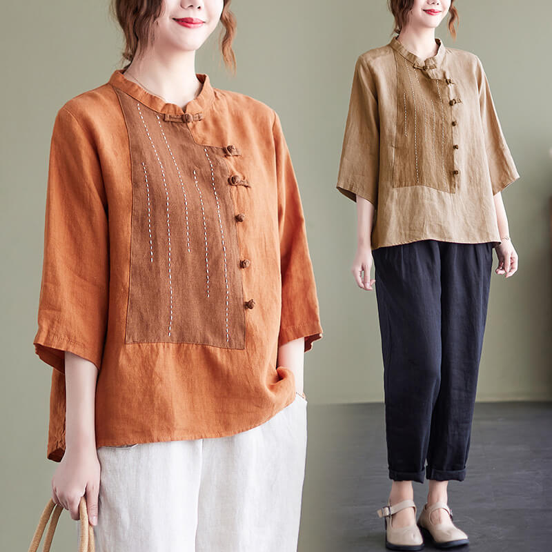 春夏季棉麻文藝複古盤扣設計感七分袖上衣