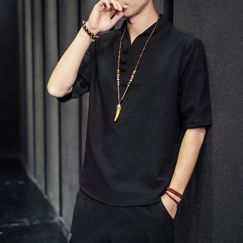夏季純色薄款盤扣亞麻短袖T恤男棉麻中袖衣服