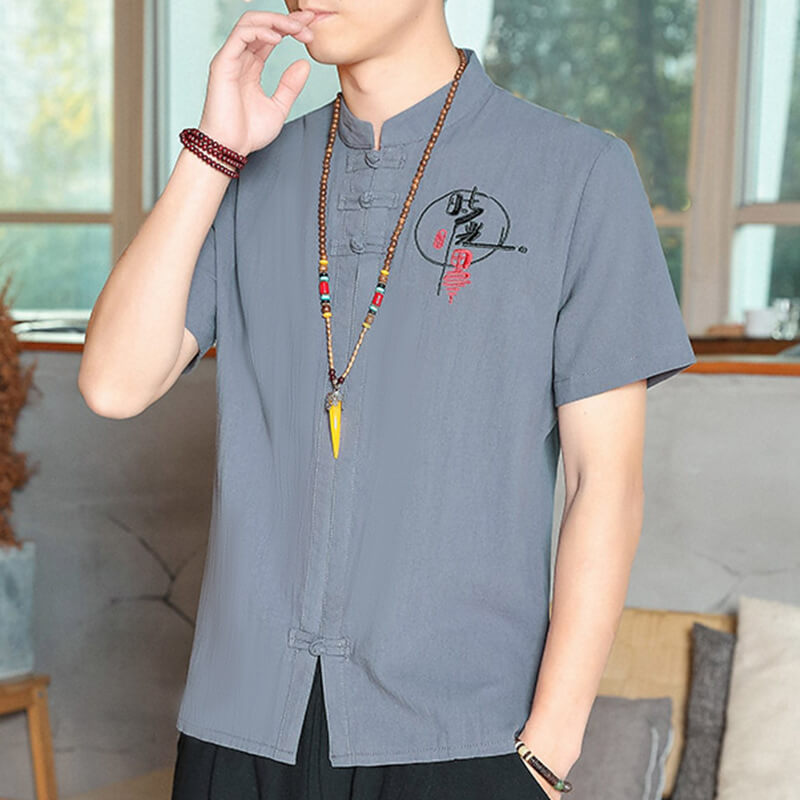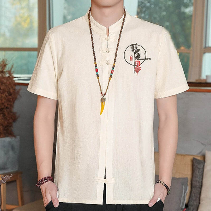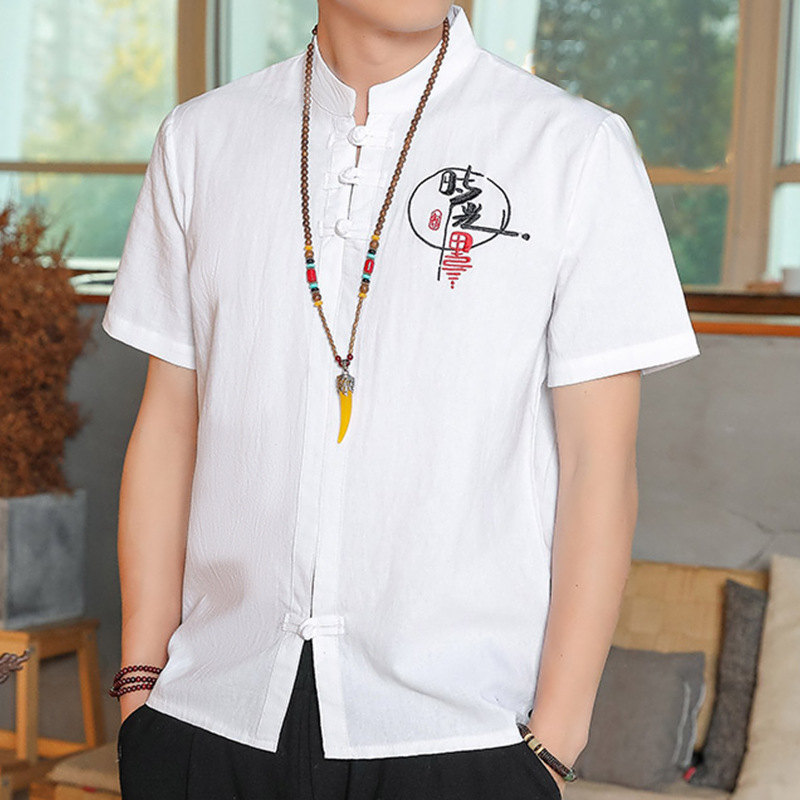 國風盤扣亞麻襯衫男士短袖T恤中式唐裝棉麻複古風男裝休閑上衣