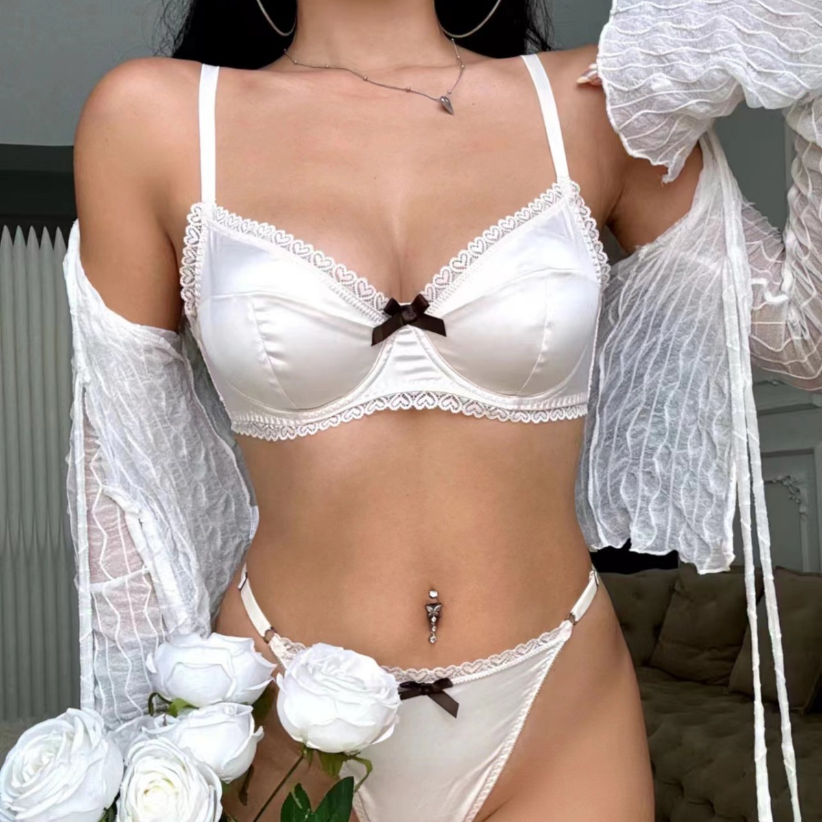 法式性感缎面蕾丝边内衣女夏季薄款大胸显小钢托防下垂文胸套装女