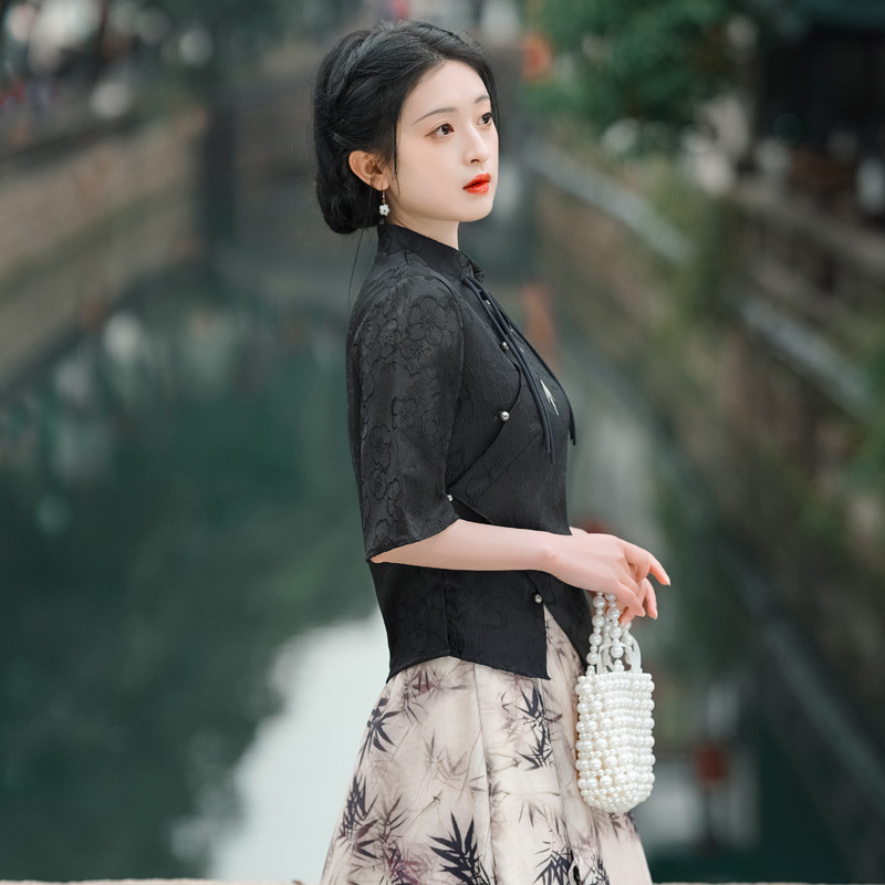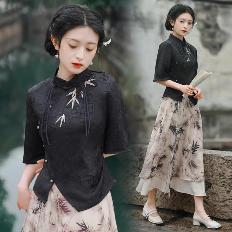 2023夏季民國風盤扣刺繡短上衣+印花半身裙