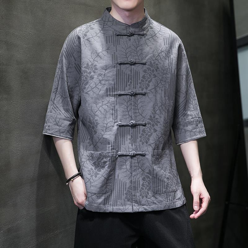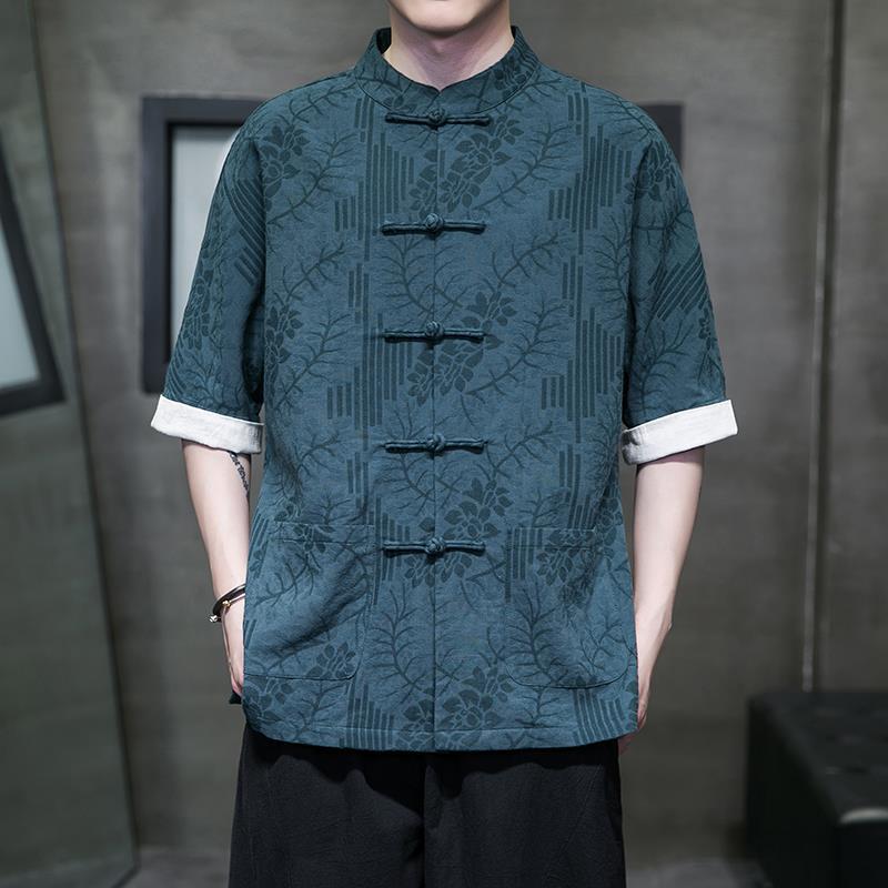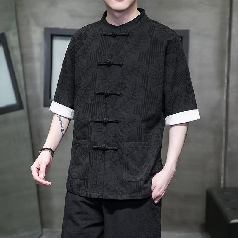 夏季新款唐裝襯衫男裝盤扣立領短袖復古立領茶服