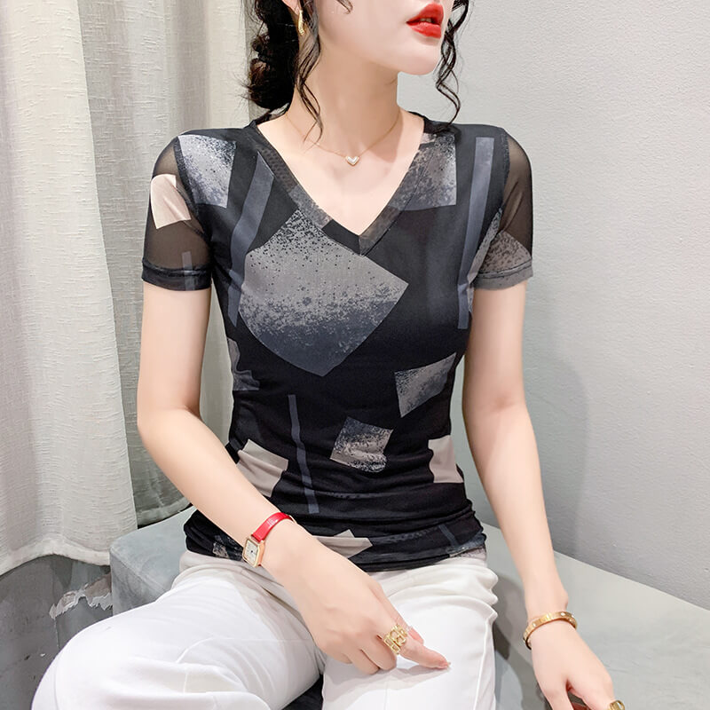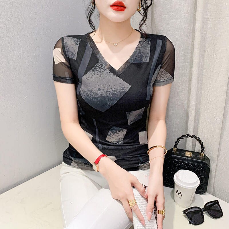 夏季新款V領印花漸變色短袖T恤上衣女
