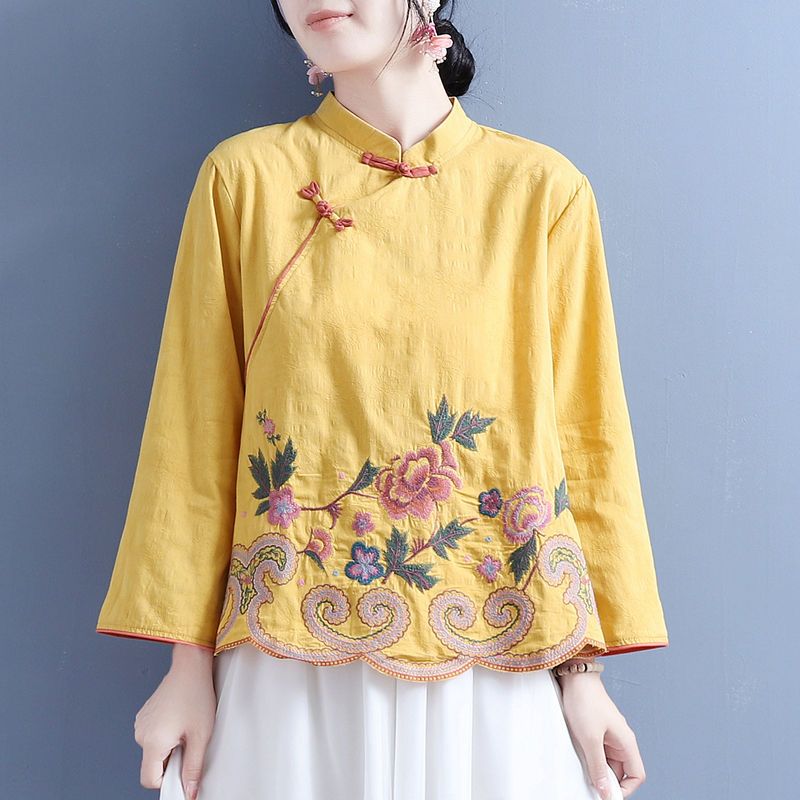 新款民族風上衣女文藝複古立領長袖上衣女中國風襯衫