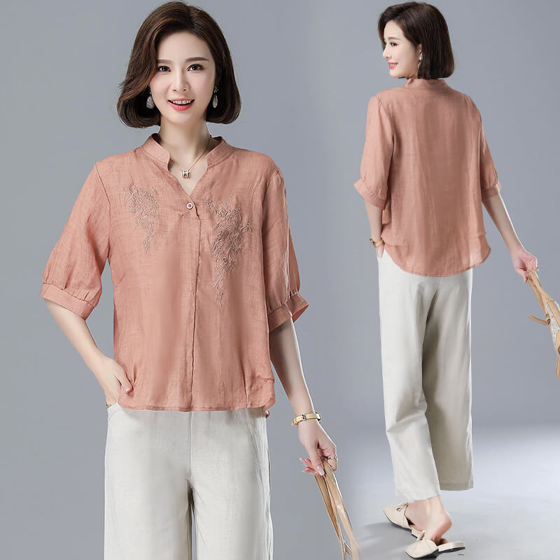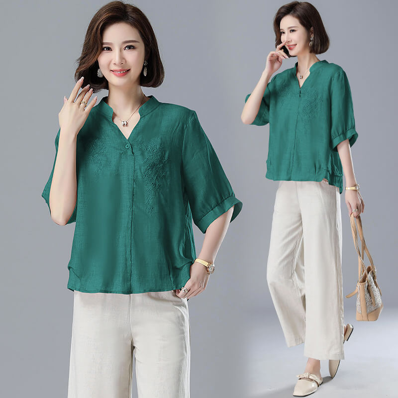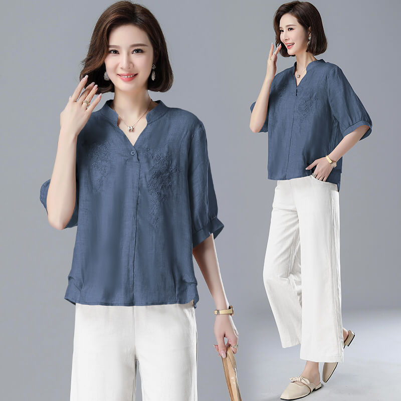 精緻氣質刺繡棉麻上衣搭配闊腿褲兩件套裝