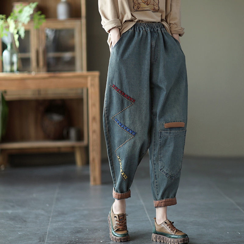 秋冬新品高腰刺绣牛仔裤女学生韩版宽松大码百搭萝卜裤哈伦裤