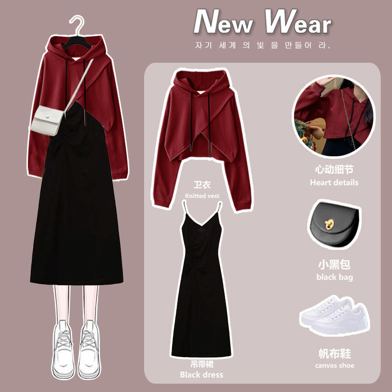 3833紅色衛衣+2960細根吊帶裙 兩件套