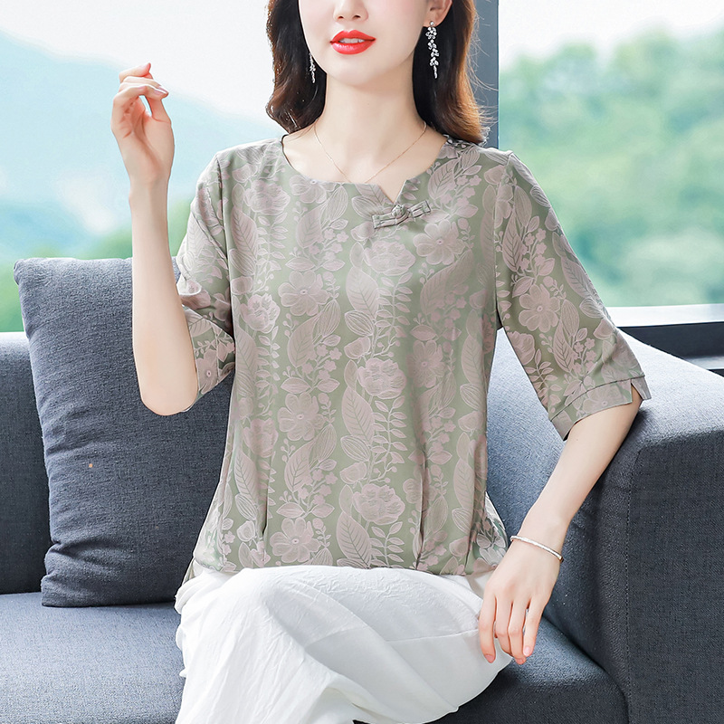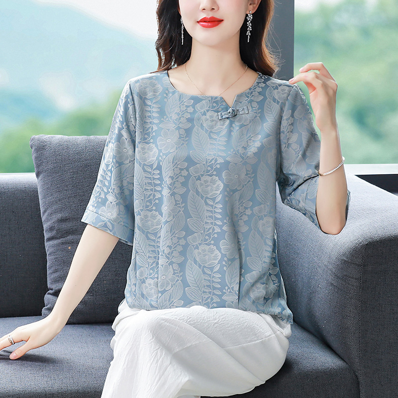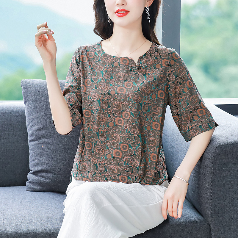 夏季媽媽短袖上衣真絲小衫女裝洋氣衣服T恤