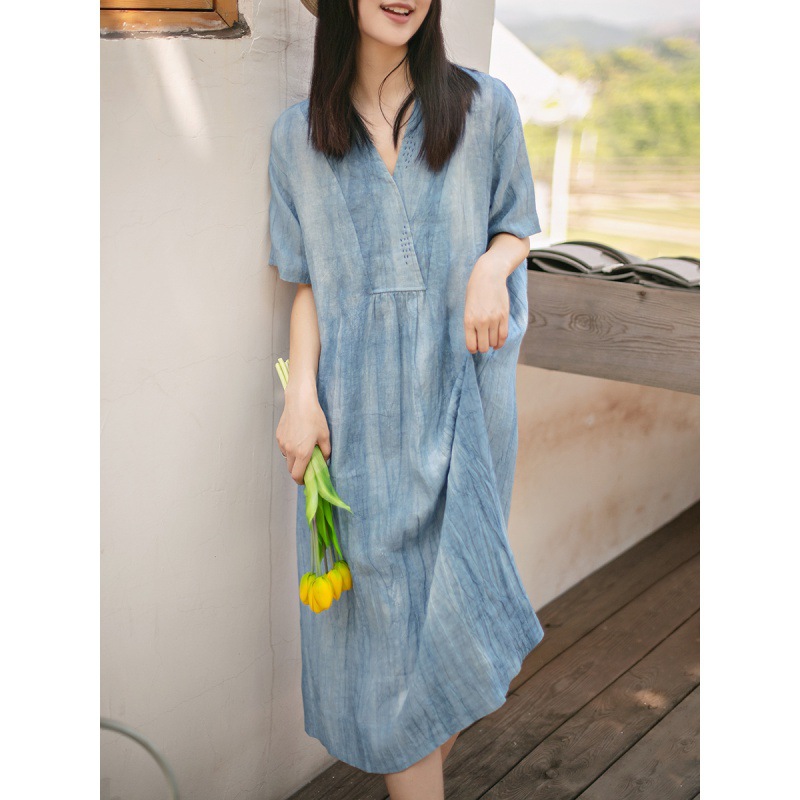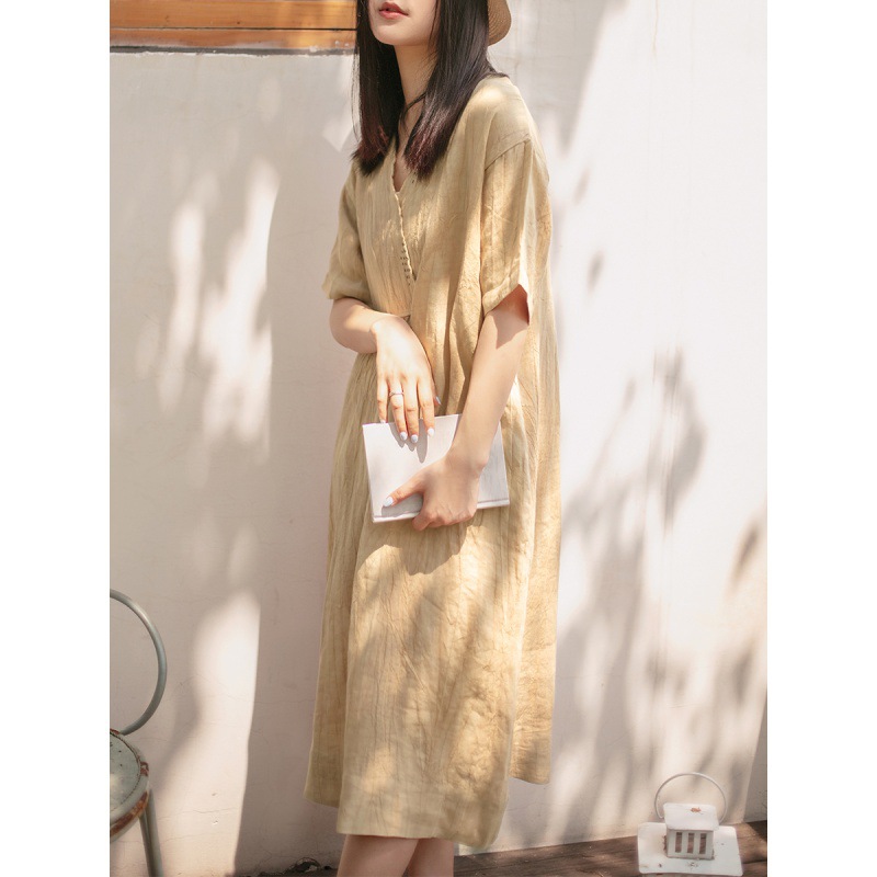 夏新款文藝簡約氣質連衣裙樹皮皺肌理亞麻寬鬆顯瘦長裙