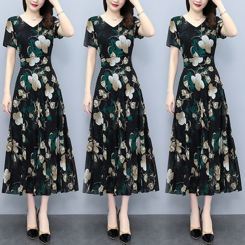 夏季短袖V領雪紡碎花連衣裙收腰顯瘦大碼連衣長裙子