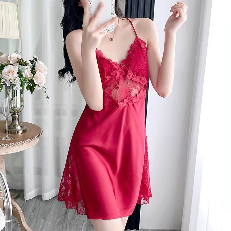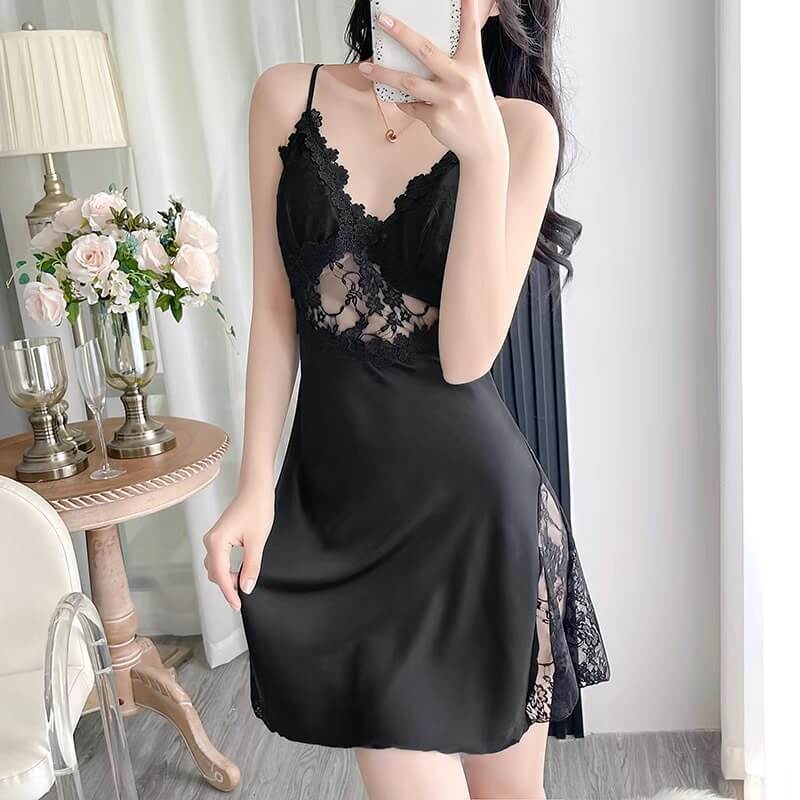 睡衣夏季新款!冰絲蕾絲吊帶睡裙~薄款網紗镂空情趣性感絲綢家居服!