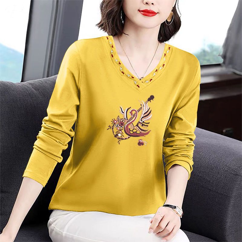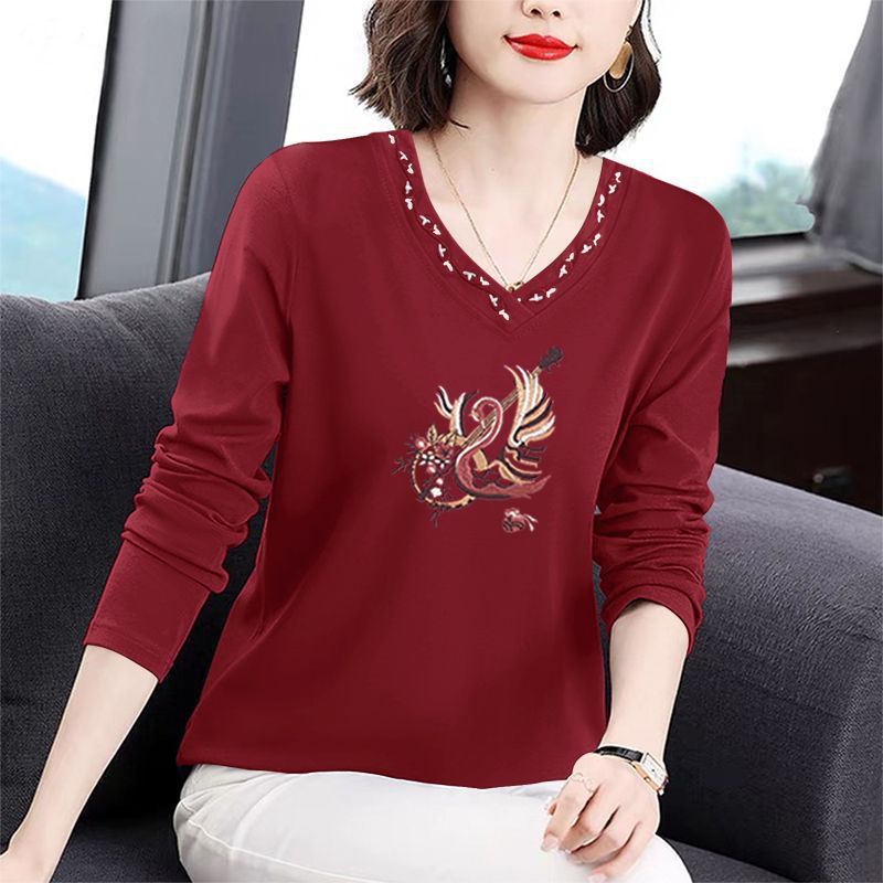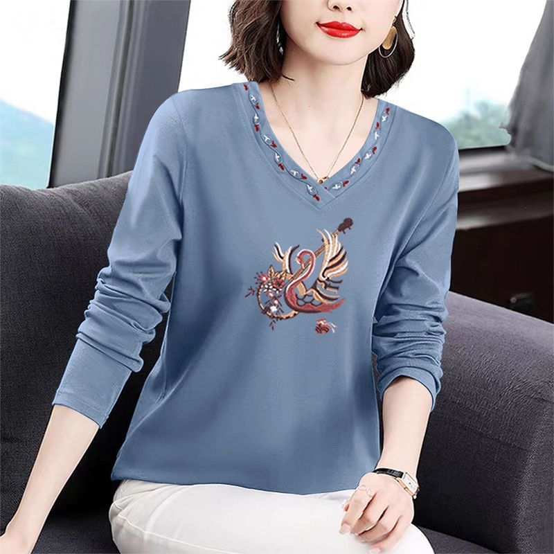 春秋季純棉長袖T恤女士v領減齡刺繡花顯瘦上衣