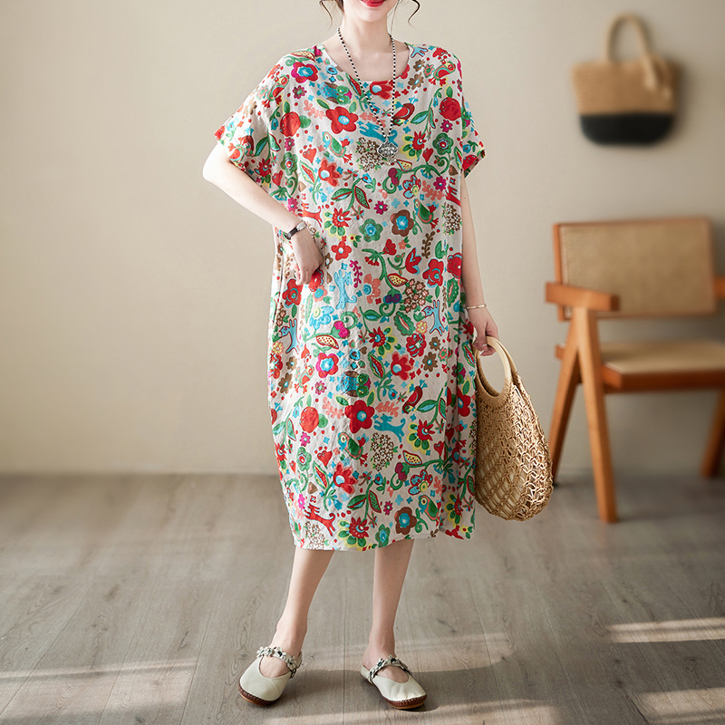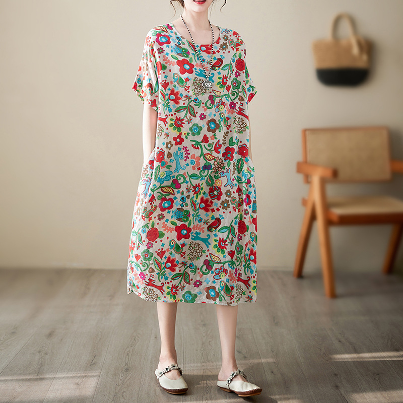 夏季大碼寬鬆短袖棉麻印花過膝氣質民族風連衣裙