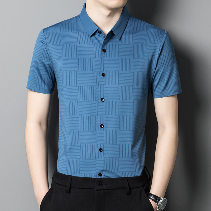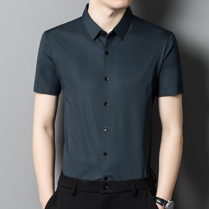 夏季休閒襯衫男款短袖翻領格子中年免燙高彈力男士襯衣