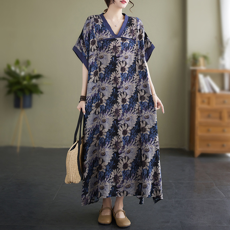 夏季復古V領棉麻印花連衣裙寬鬆沙灘長裙