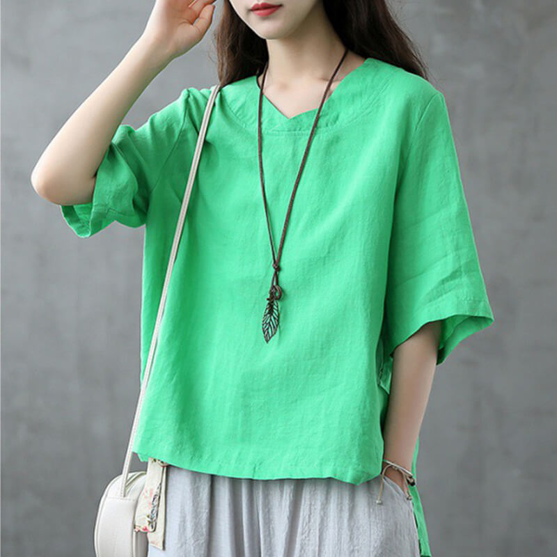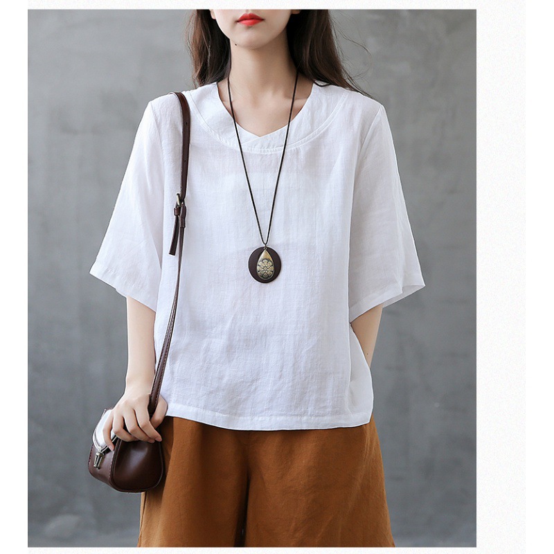 寬鬆不規則領口設計開衩棉麻短袖T恤