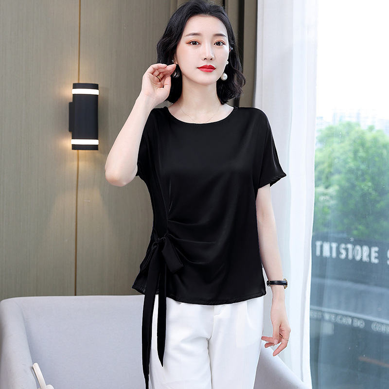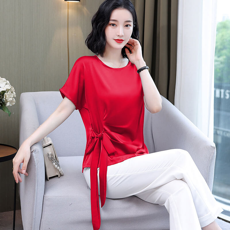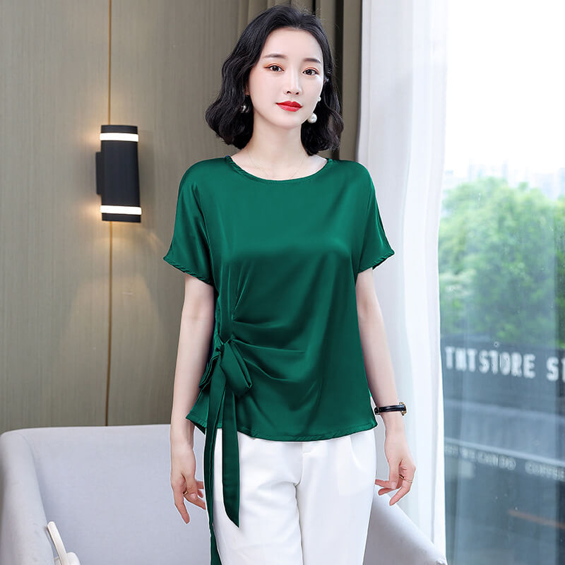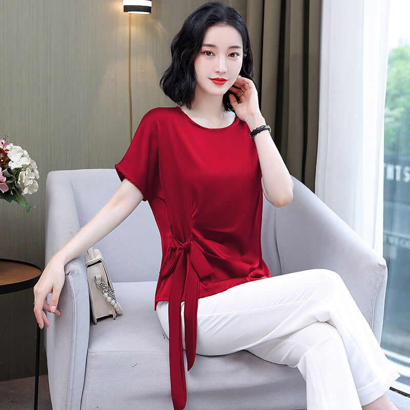 夏新款仿真絲繫帶收腰設計短袖襯衫上衣