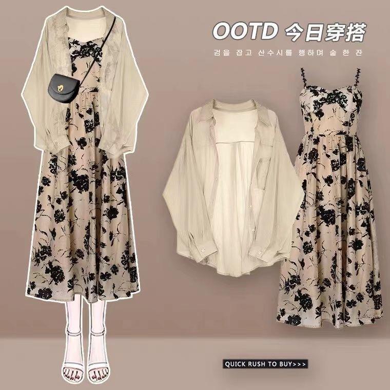 防曬襯衫+碎花吊帶裙 兩件套